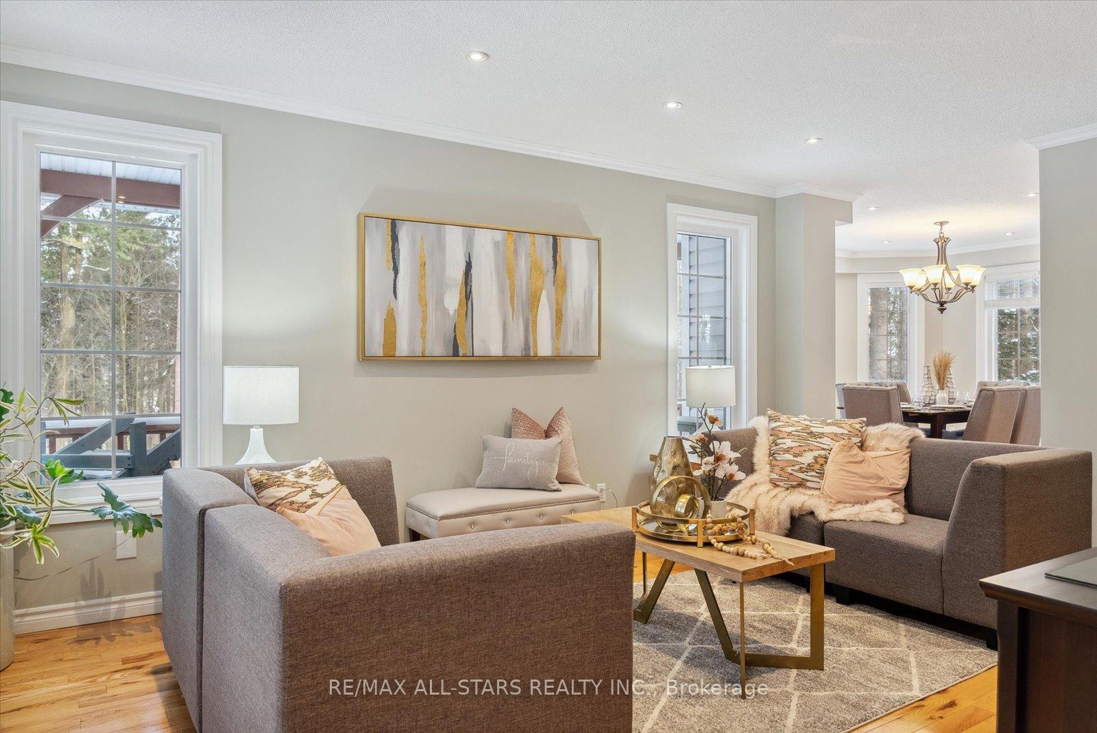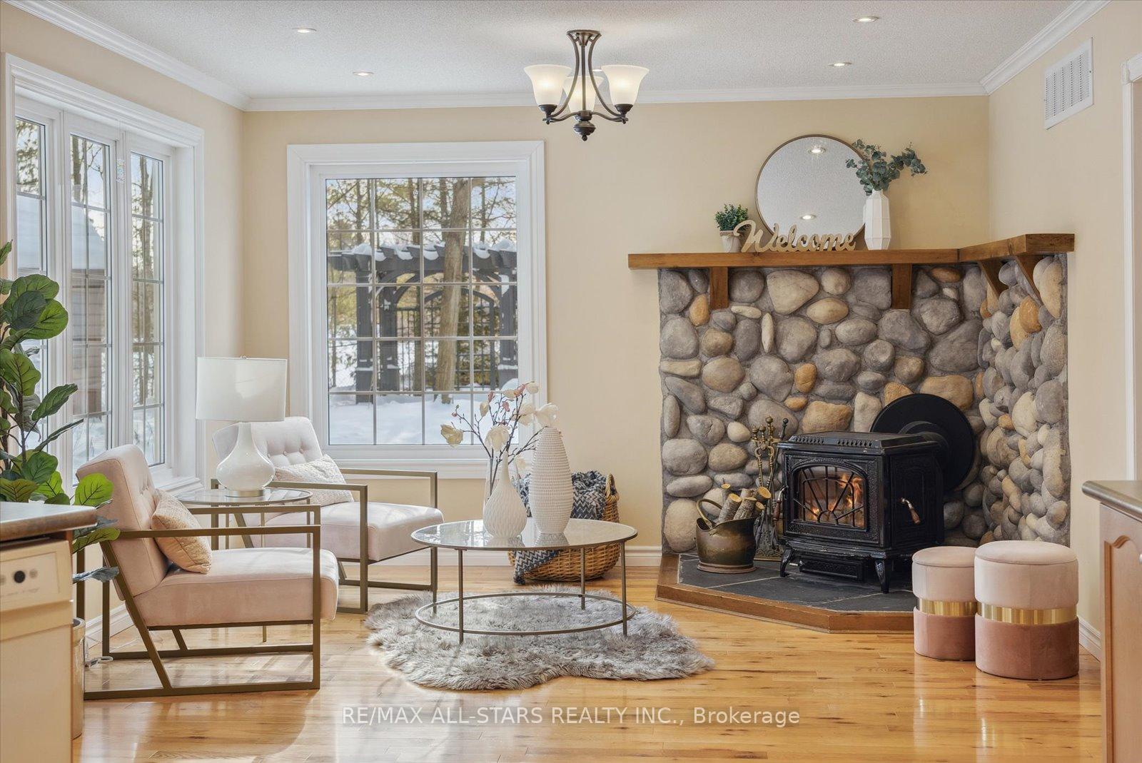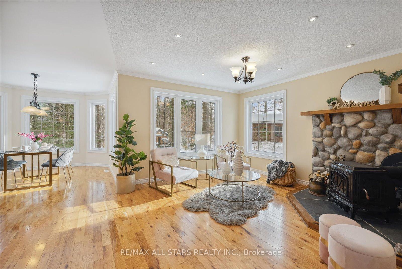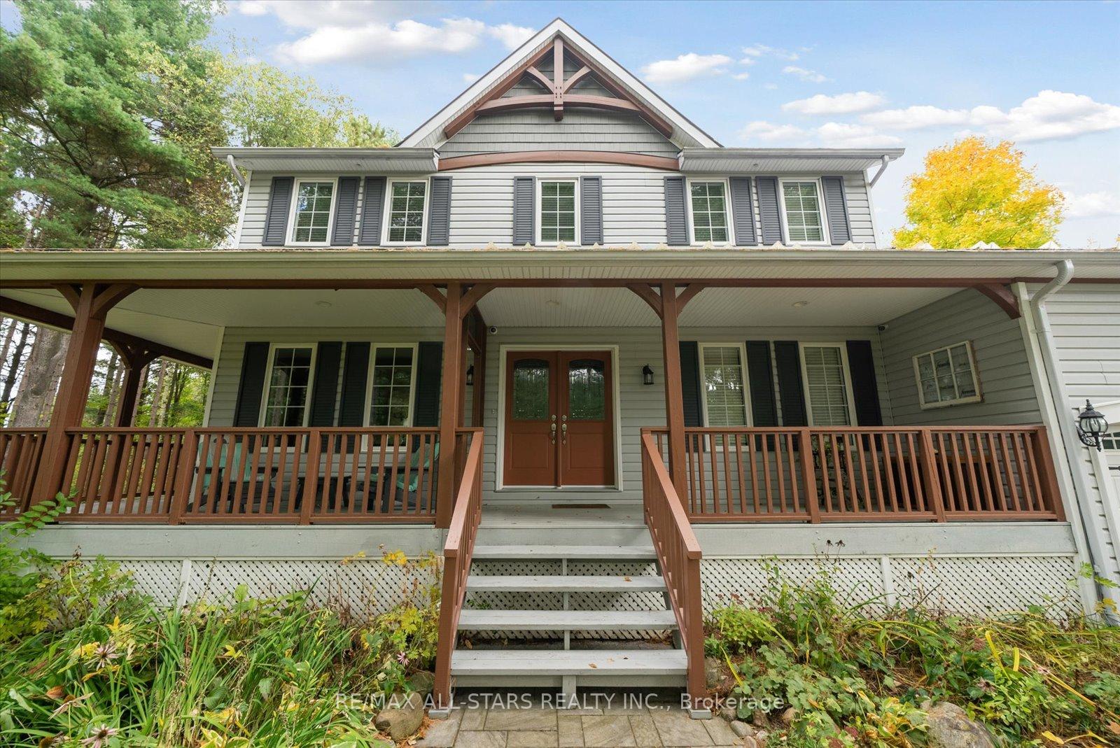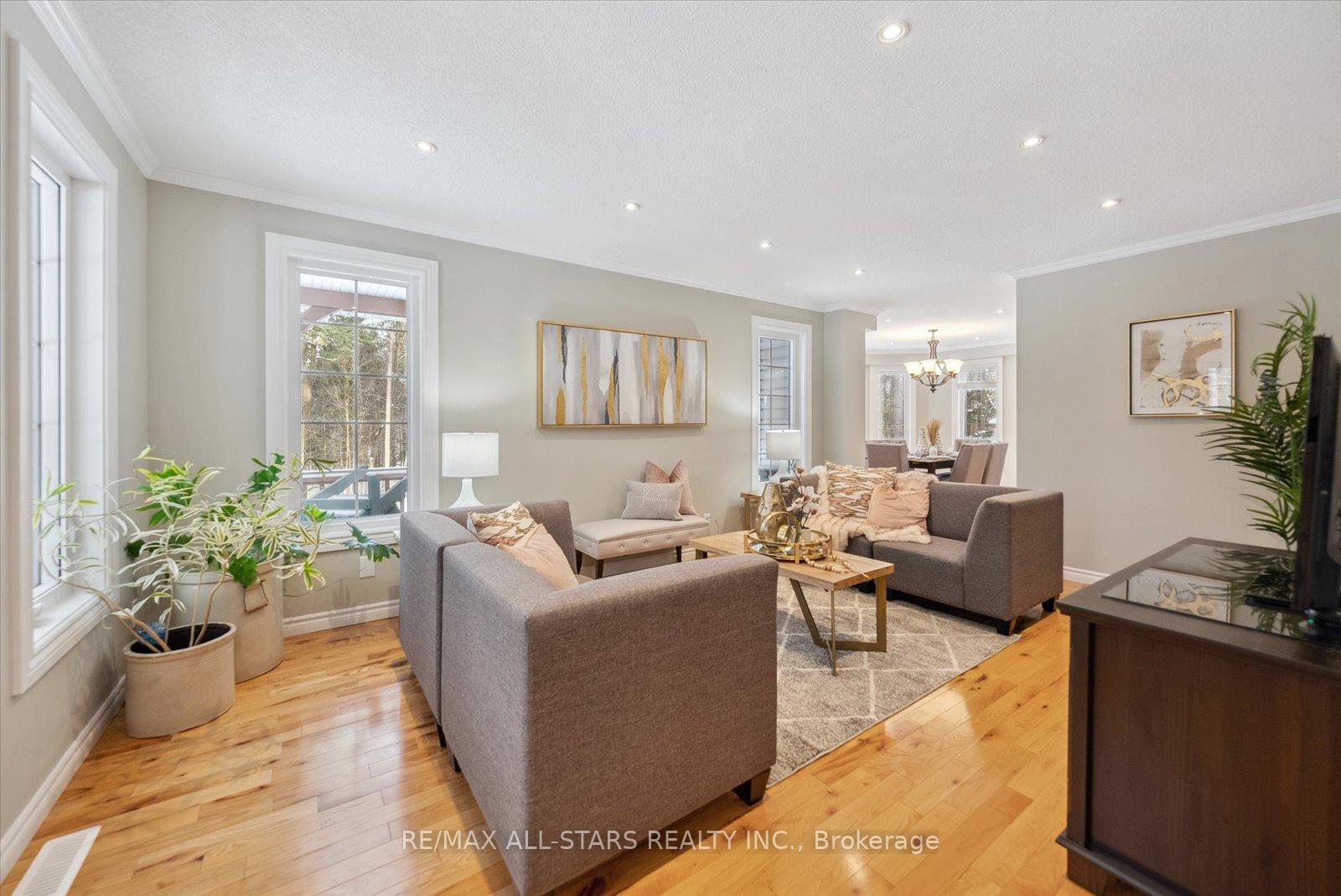 Nestled in the sought-after village of Hillsdale, this exceptional 1.5+ acre estate, one of the largest in the community offers a rare opportunity to own a private, meticulously maintained 2500sq/ft "Winslow" model home by Hedburn. Set among mature trees and backing onto lush greenery, the property is accessed by a 240-ft driveway and features a triple car garage with oversized 9-ft doors. Beautifully landscaped grounds include a wrap-around covered porch with screened-in area, custom shed, and hexagon cedar gazebo, both with steel roofs, ideal for outdoor living. A grand double-door entry opens to a bright, thoughtfully designed main floor.The open-concept kitchen and breakfast area flows into a warm great room with a WETT certified wood-burning stove. Formal living and dining room add elegance, while a main floor bedroom/office, laundry room with garage access, and powder room offer everyday convenience. Upstairs, the spacious primary suite features a walk-in closet and large ensuite bath, complemented by three additional well-sized bedrooms and a full bath. Timeless finishes include gleaming hardwood flooring, crown moulding, pot lights, and 37 updated windows. The partially finished basement offers a large rec room, workshop, and ample storage. Additional features include a steel roof (50 year warranty), 8-zone irrigation, timber accents, high-speed fibre optic internet, city water, natural gas, high-efficiency furnace, owned hot water heater, and low property taxes. Direct access to walking trails and OFSC routes. Conveniently located near Barrie, Orillia, Midland, Georgian Bay, and within walking distance to the local school. A rare offering where privacy, space, and quality meet. An exceptional lifestyle awaits!