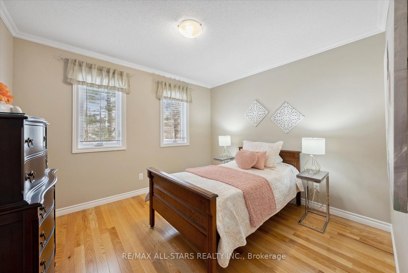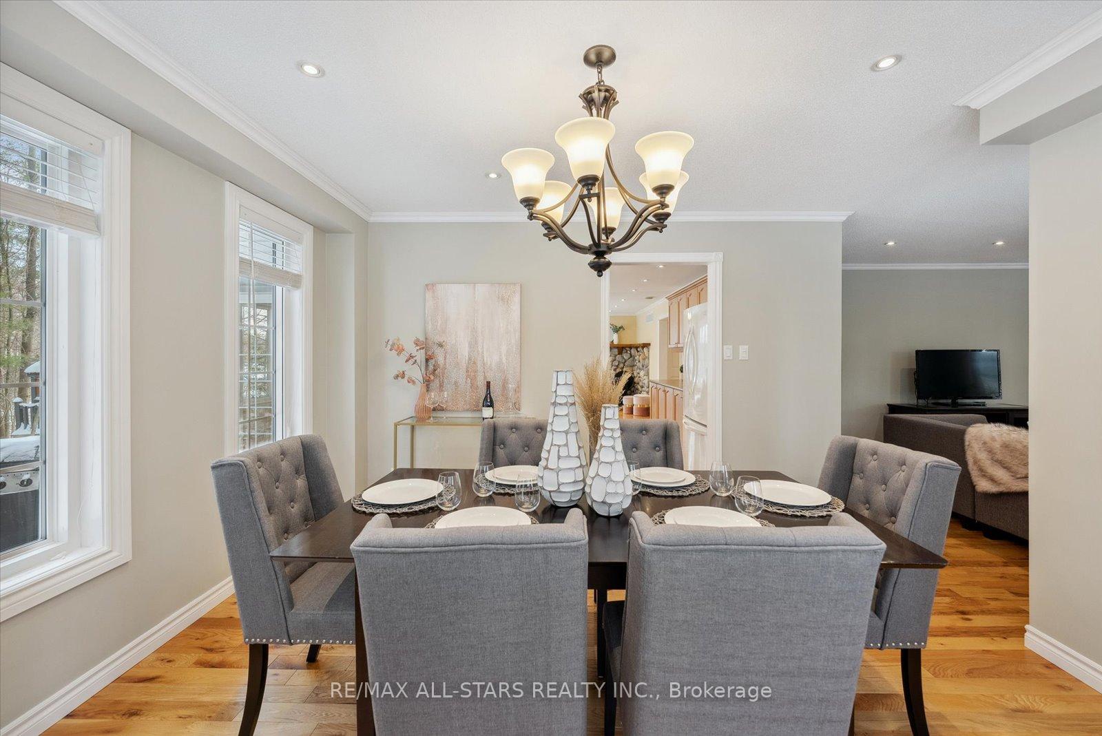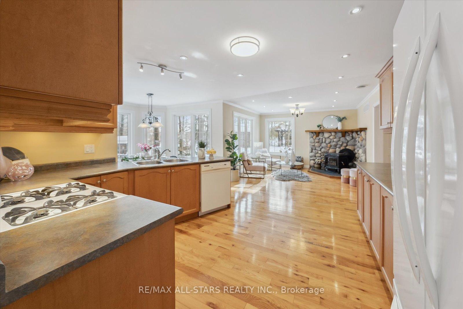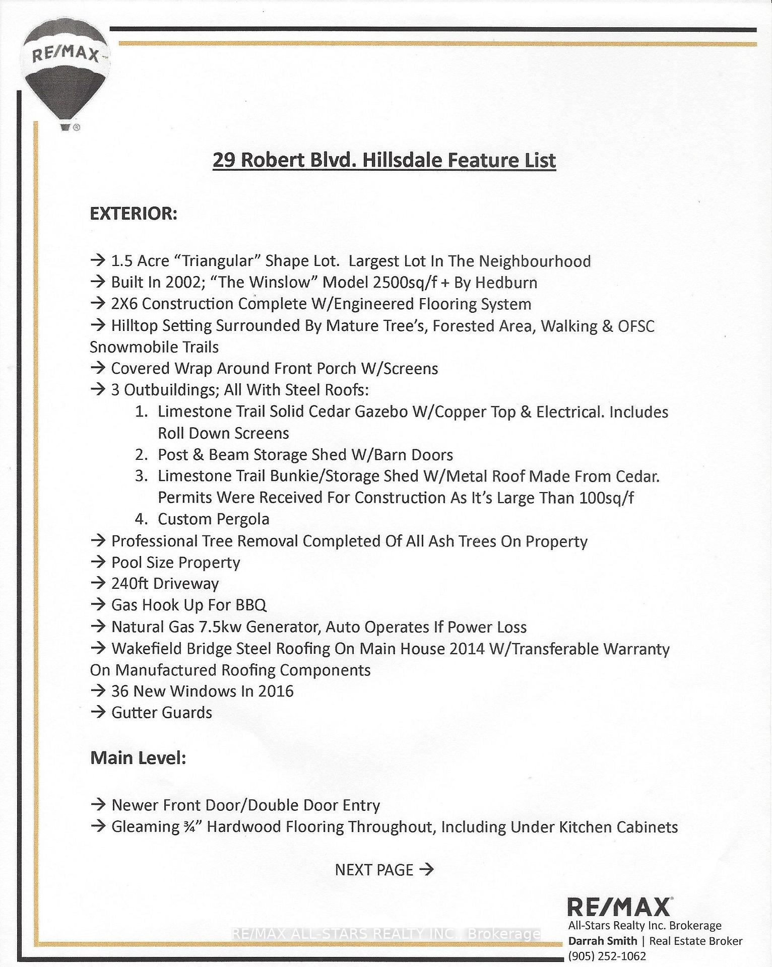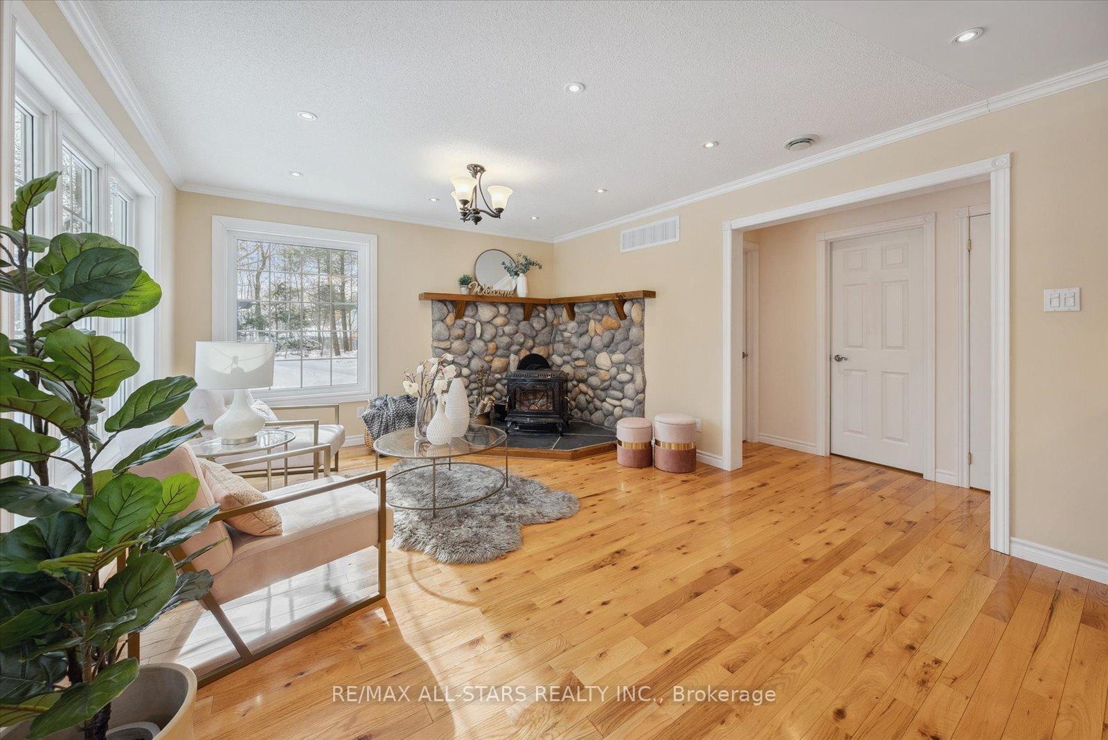 Nestled in the sought-after village of Hillsdale, this exceptional 1.5+ acre estate, one of the largest in the community offers a rare opportunity to own a private, meticulously maintained 2500sq/ft "Winslow" model home by Hedburn. Set among mature trees and backing onto lush greenery, the property is accessed by a 240-ft driveway and features a triple car garage with oversized 9-ft doors. Beautifully landscaped grounds include a wrap-around covered porch with screened-in area, custom shed, and hexagon cedar gazebo, both with steel roofs, ideal for outdoor living. A grand double-door entry opens to a bright, thoughtfully designed main floor.The open-concept kitchen and breakfast area flows into a warm great room with a WETT certified wood-burning stove. Formal living and dining room add elegance, while a main floor bedroom/office, laundry room with garage access, and powder room offer everyday convenience. Upstairs, the spacious primary suite features a walk-in closet and large ensuite bath, complemented by three additional well-sized bedrooms and a full bath. Timeless finishes include gleaming hardwood flooring, crown moulding, pot lights, and 37 updated windows. The partially finished basement offers a large rec room, workshop, and ample storage. Additional features include a steel roof (50 year warranty), 8-zone irrigation, timber accents, high-speed fibre optic internet, city water, natural gas, high-efficiency furnace, owned hot water heater, and low property taxes. Direct access to walking trails and OFSC routes. Conveniently located near Barrie, Orillia, Midland, Georgian Bay, and within walking distance to the local school. A rare offering where privacy, space, and quality meet. An exceptional lifestyle awaits!